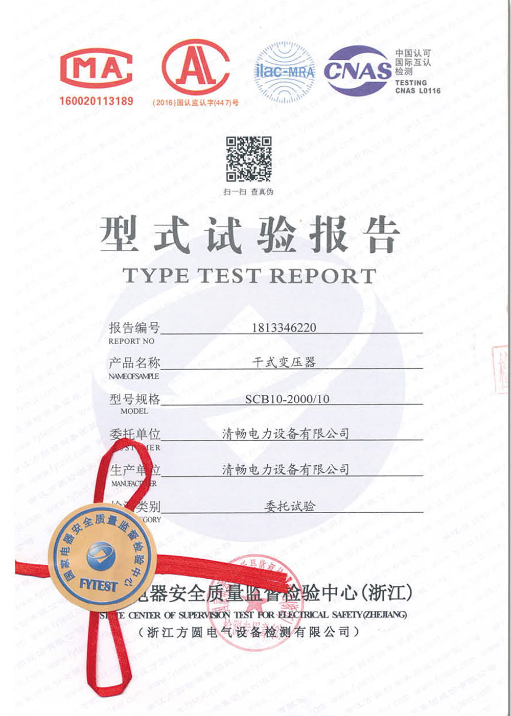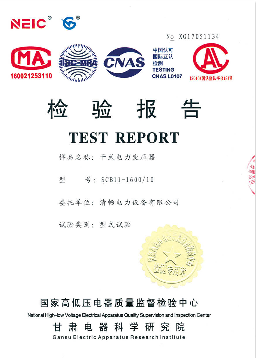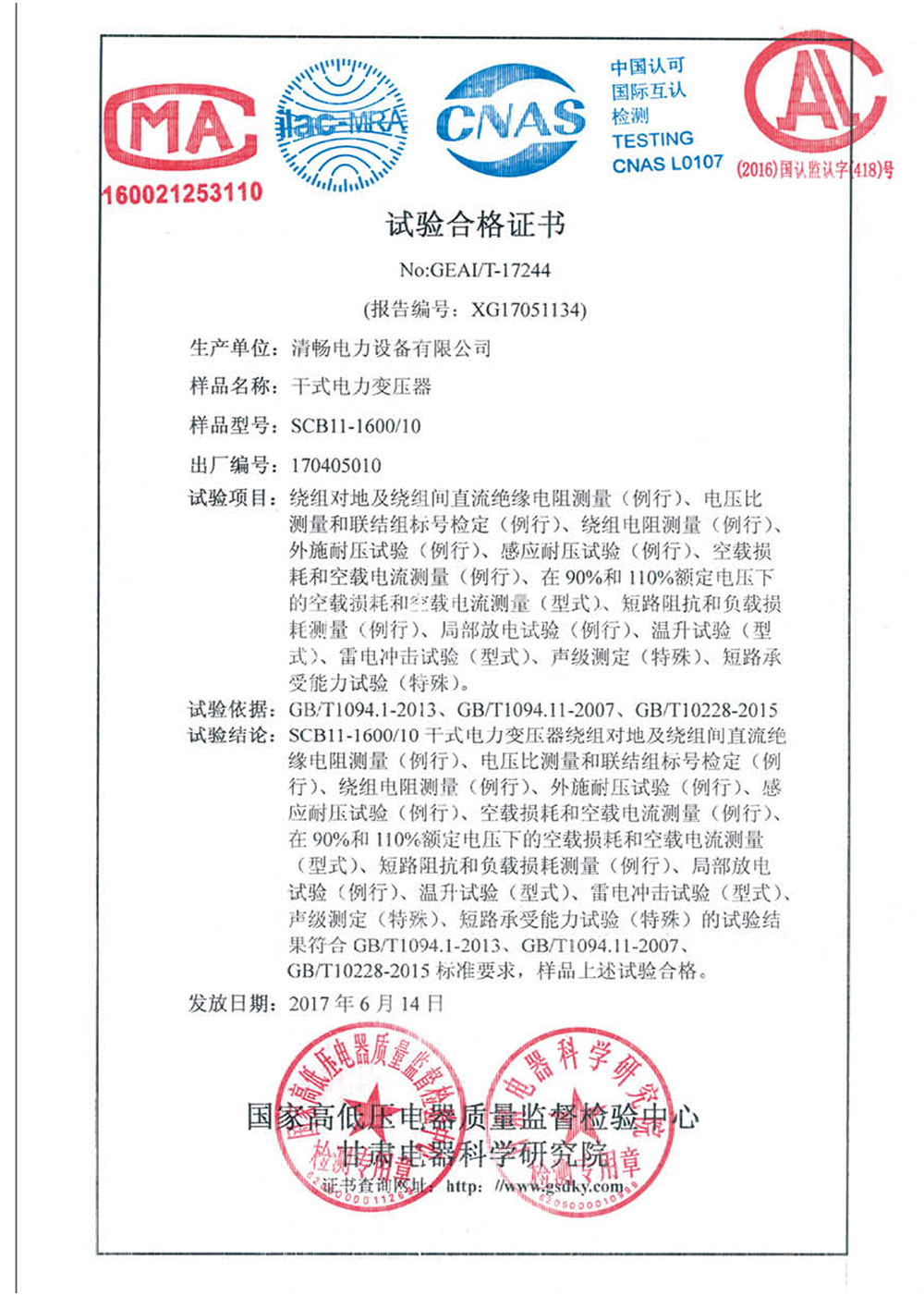 SCB11-1600/10干式變壓器檢驗報告