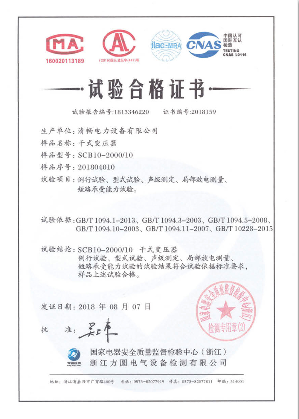 SCB10-2000/10干式變壓器試驗合格證書